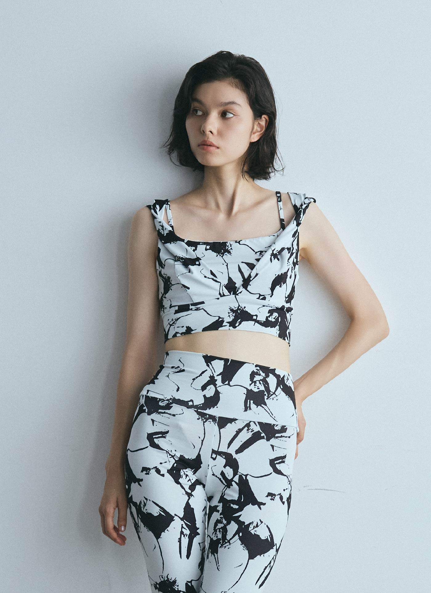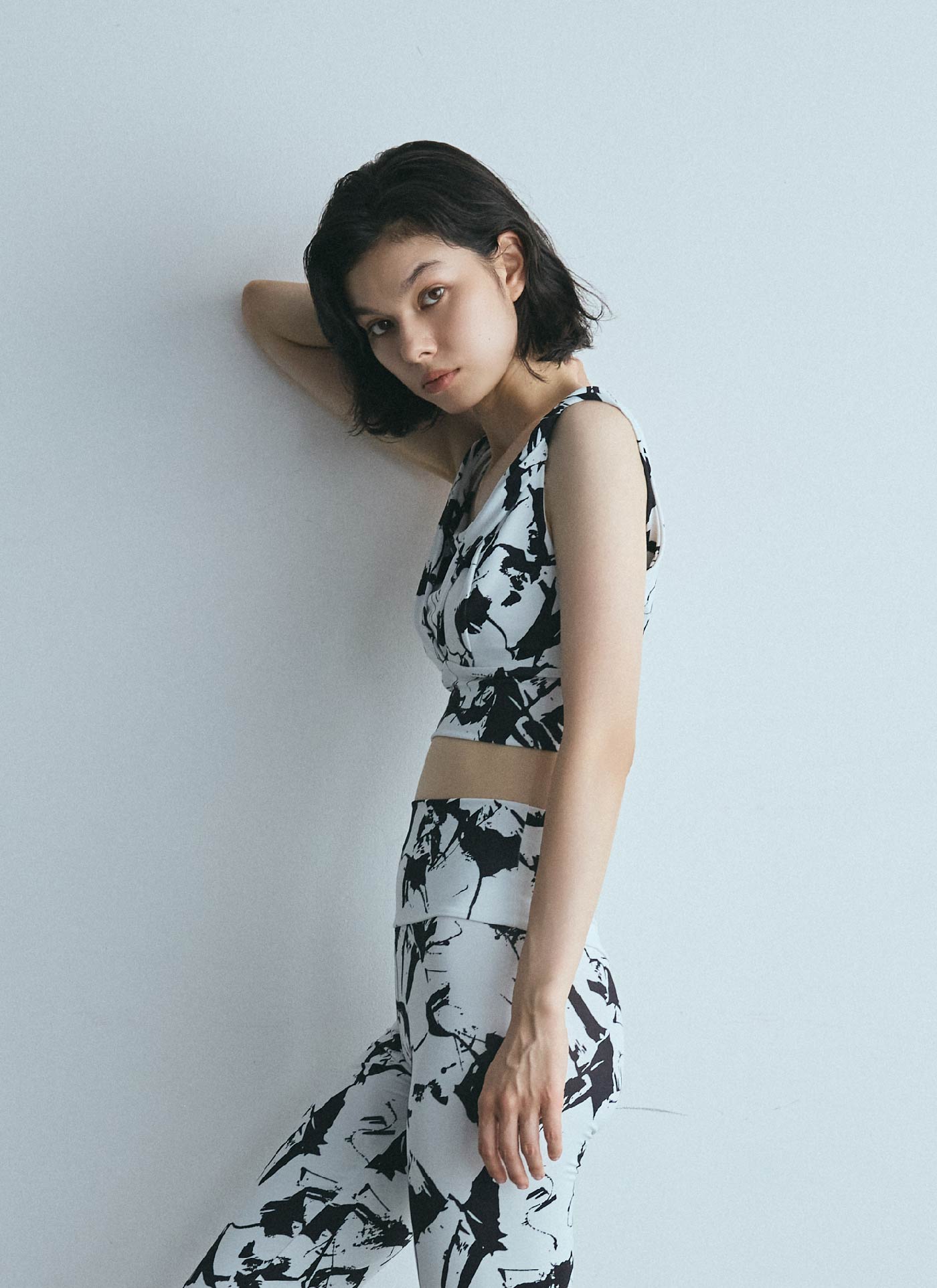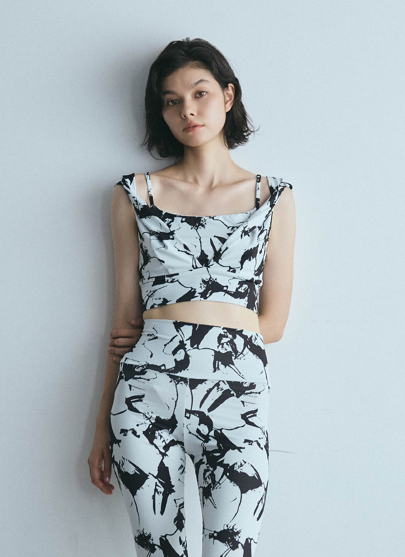 ショルダーツイストのレイヤード布がアンダーでドッキングされており、気になる脇のくいこみなどをカモフラージュ。