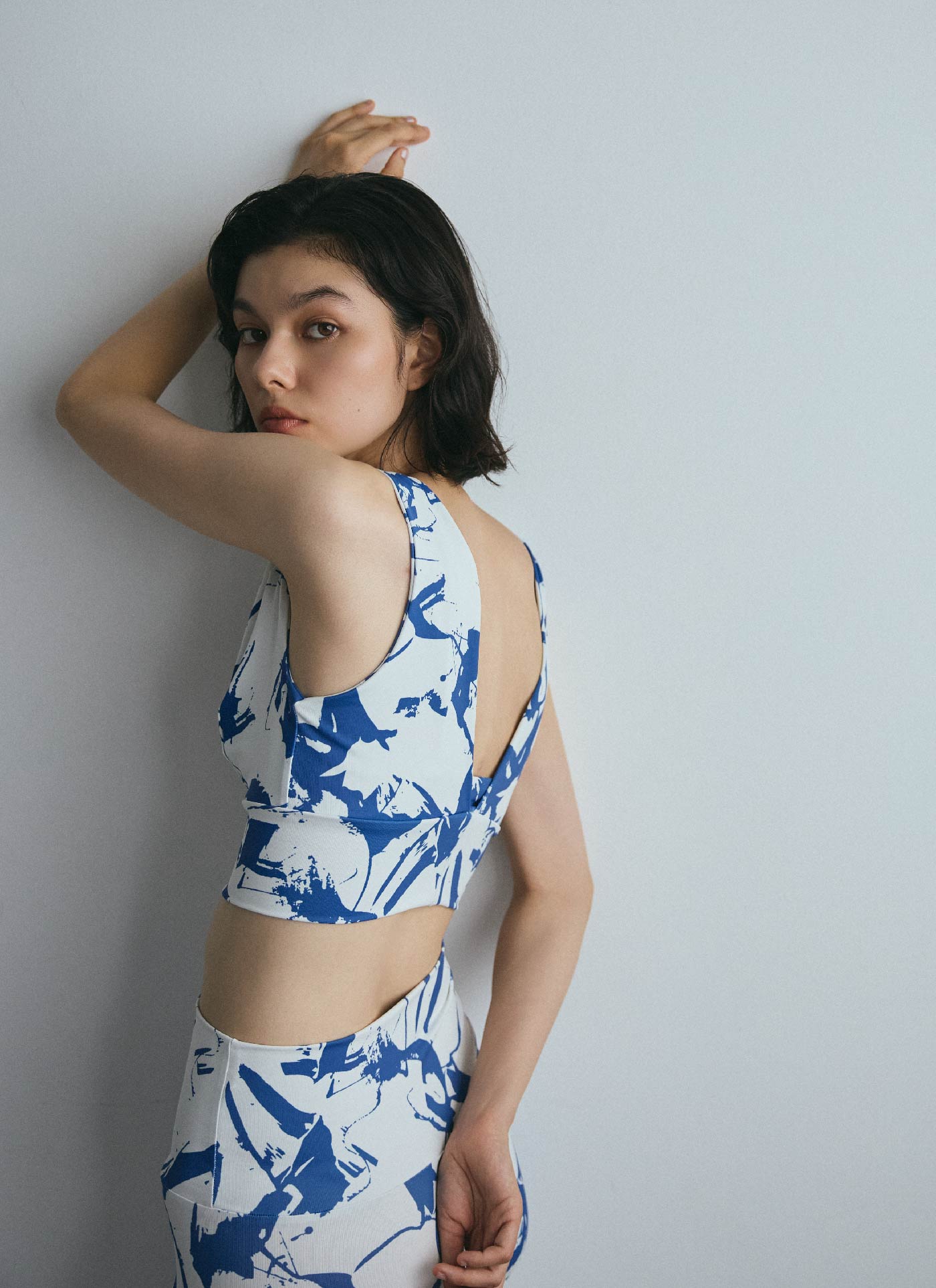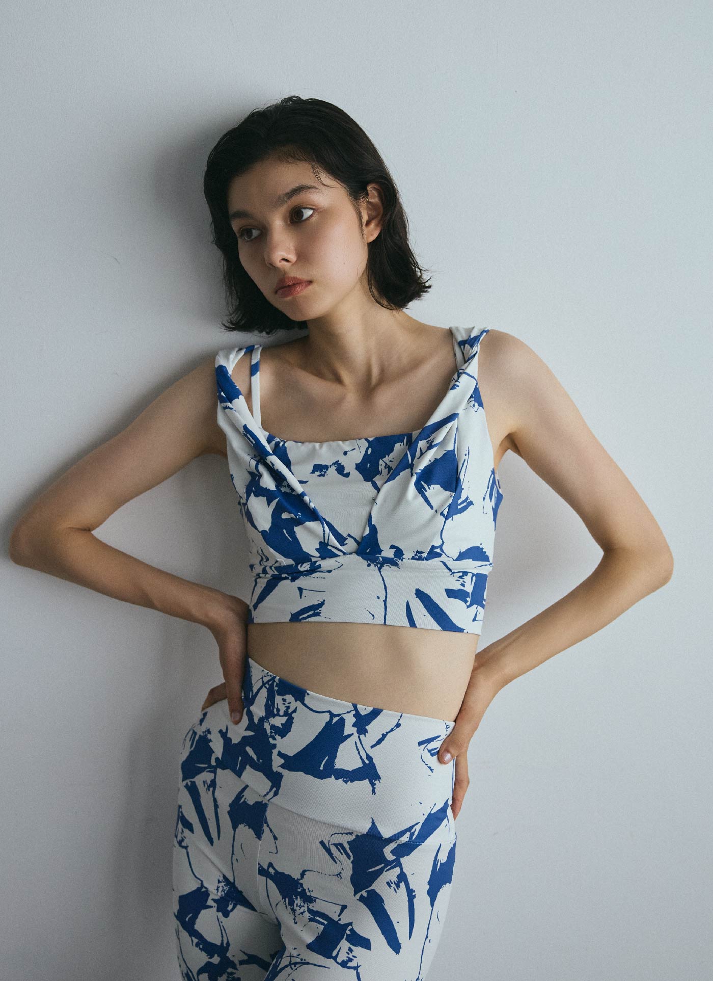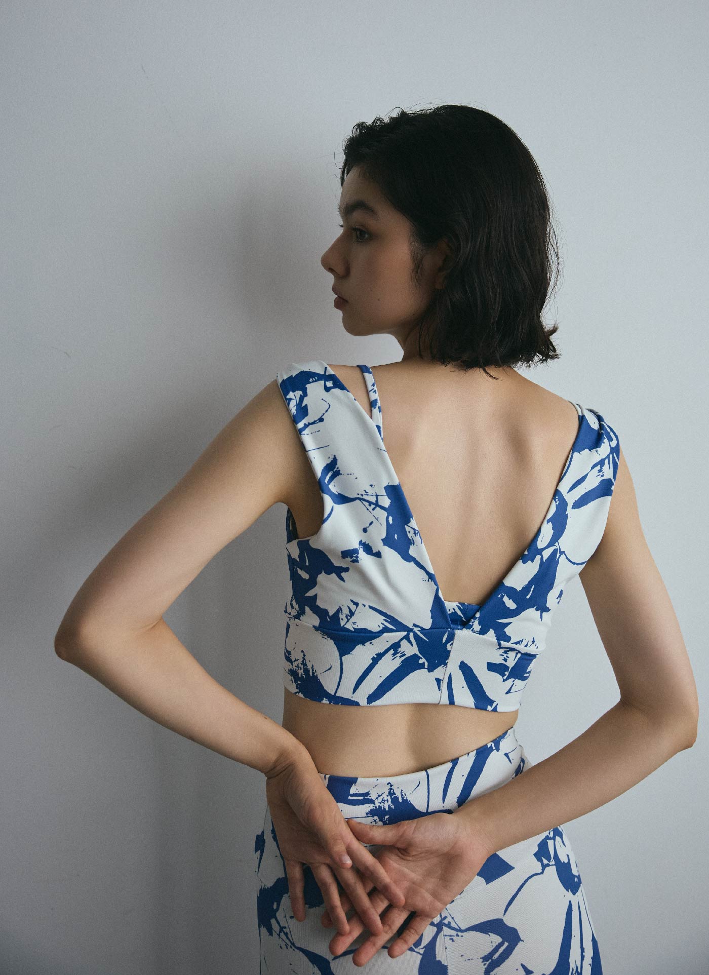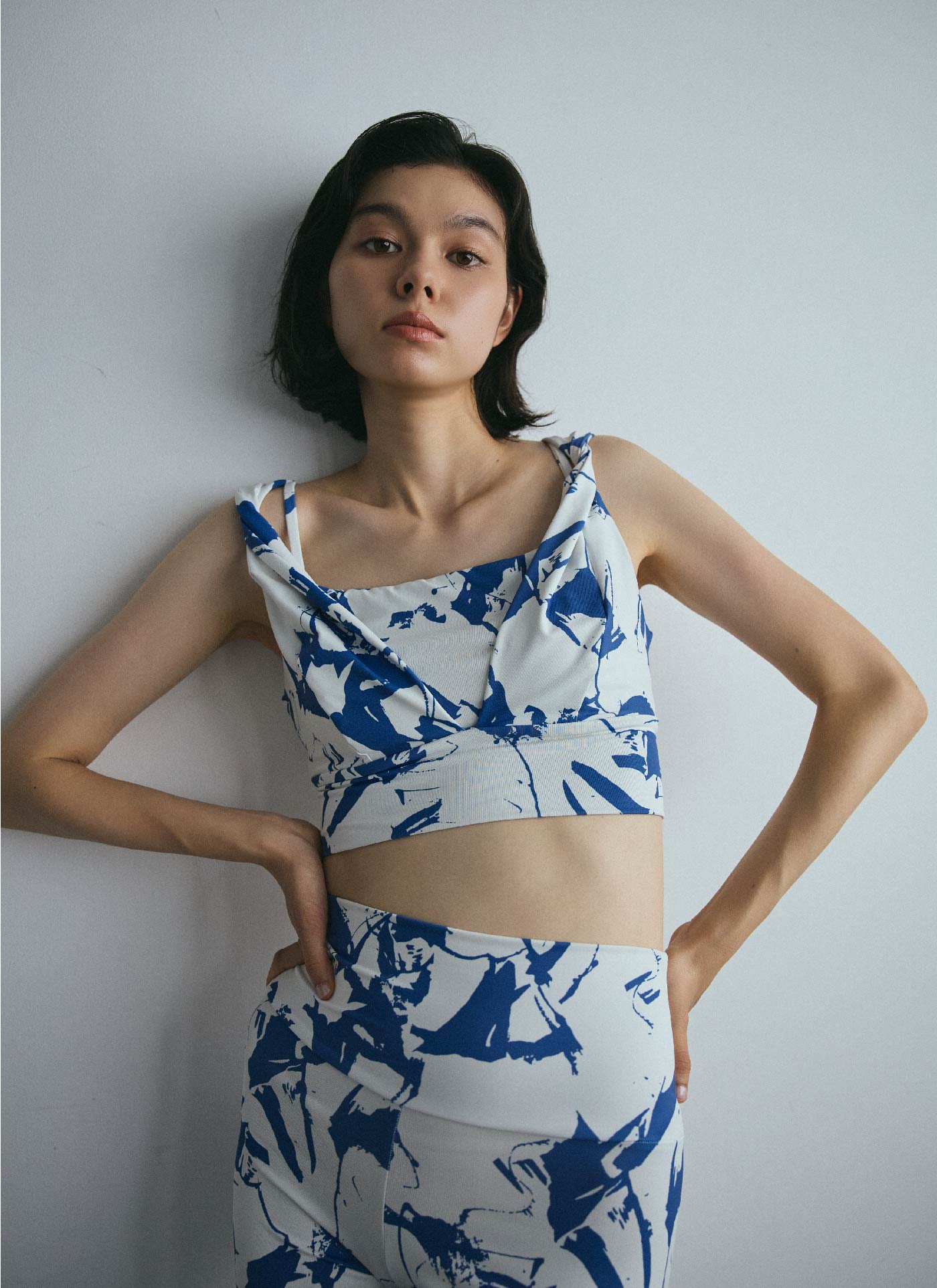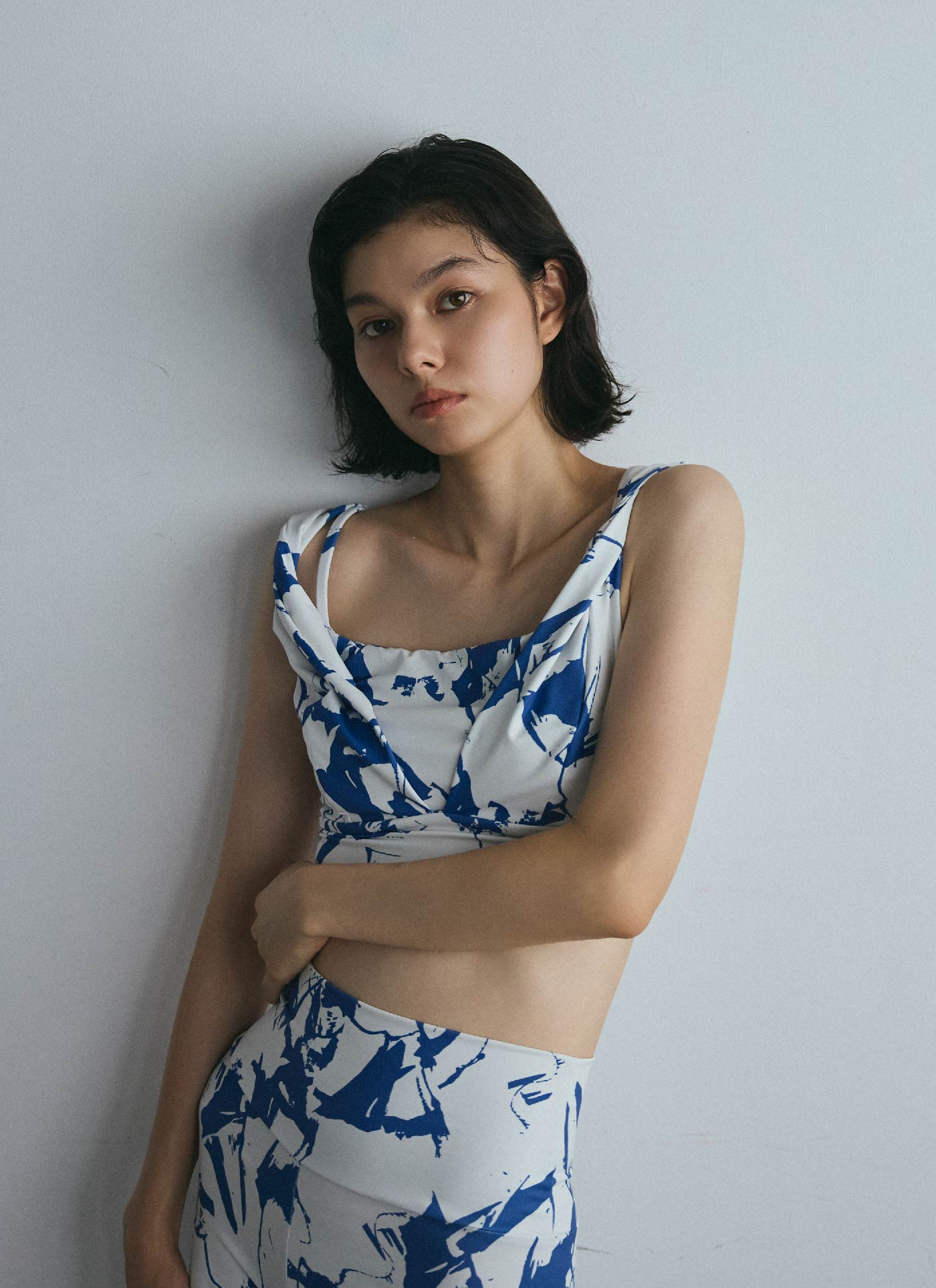 ショルダーツイストのレイヤード布がアンダーでドッキングされており、気になる脇のくいこみなどをカモフラージュ。