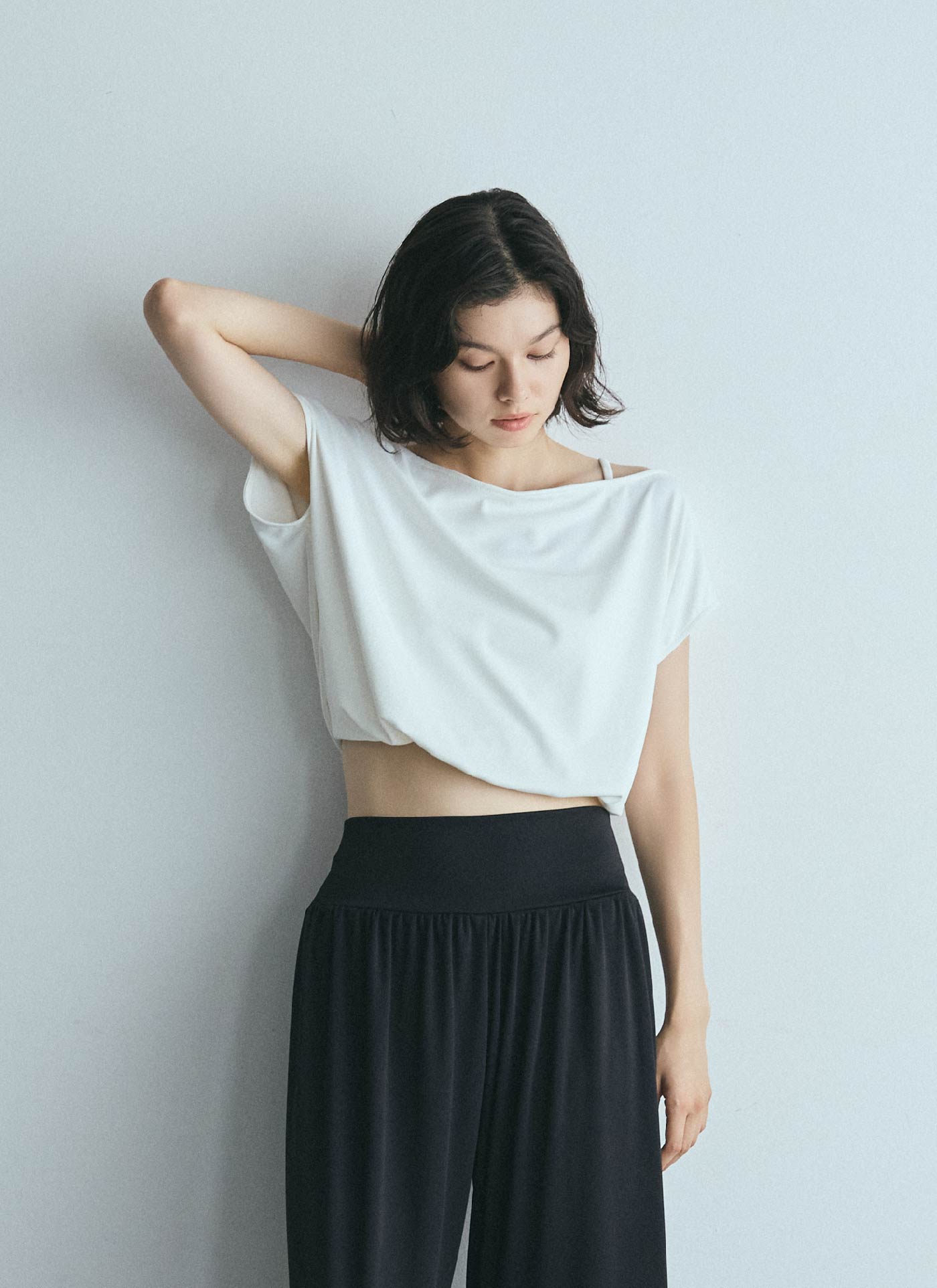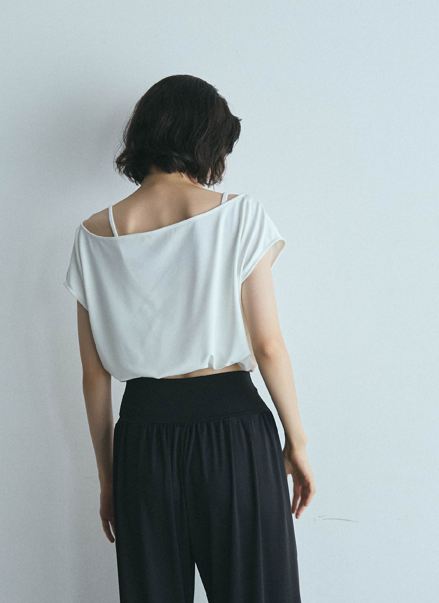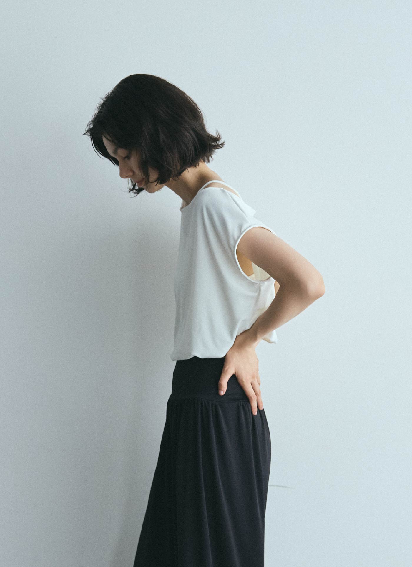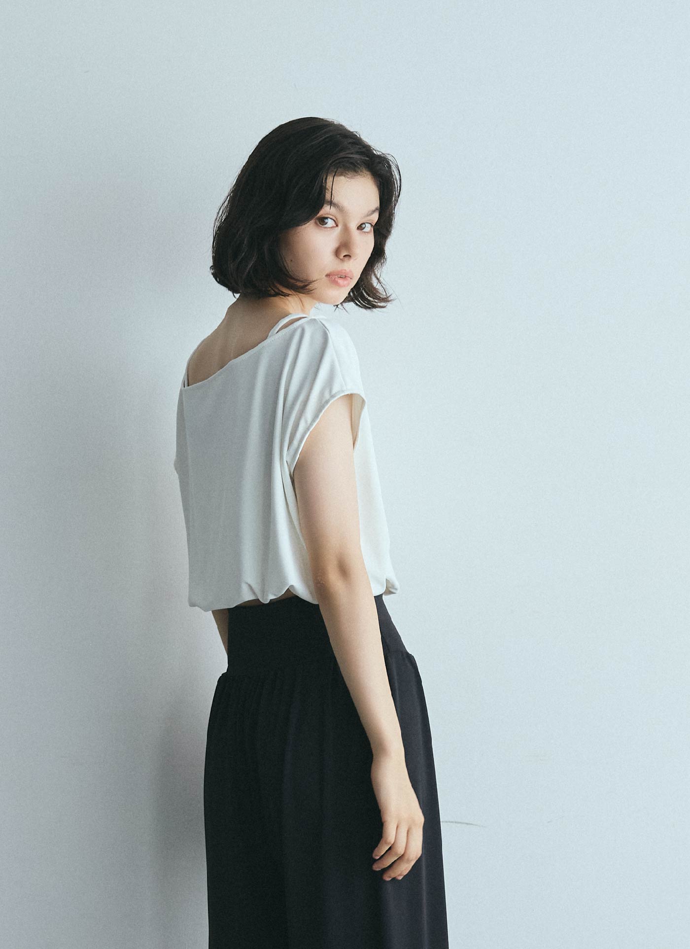 ショルダーラインが美しく見えるよう計算されたカットで鎖骨を演出
